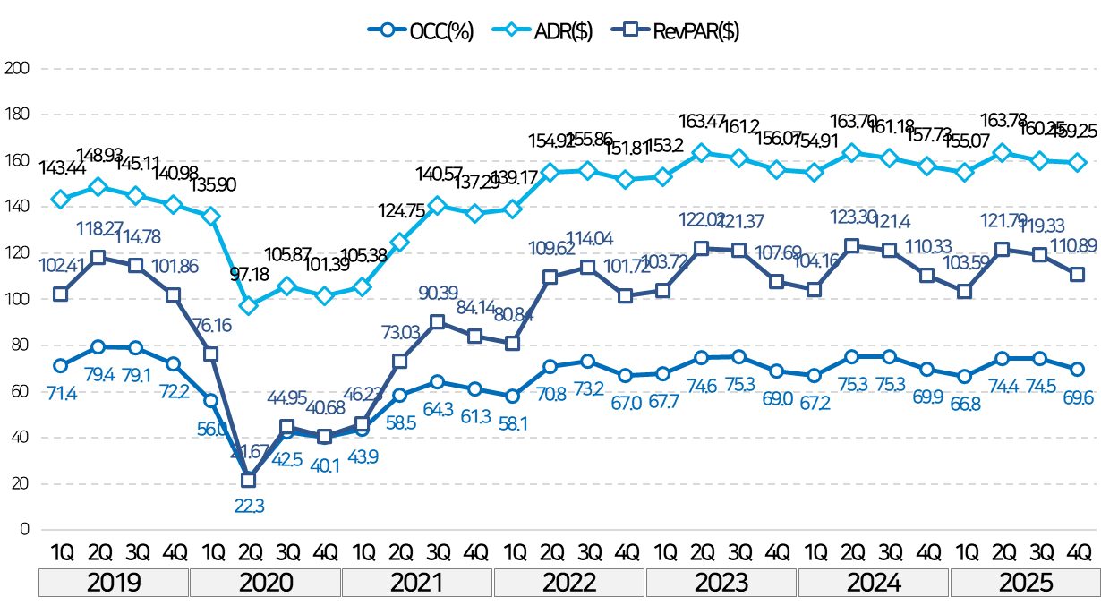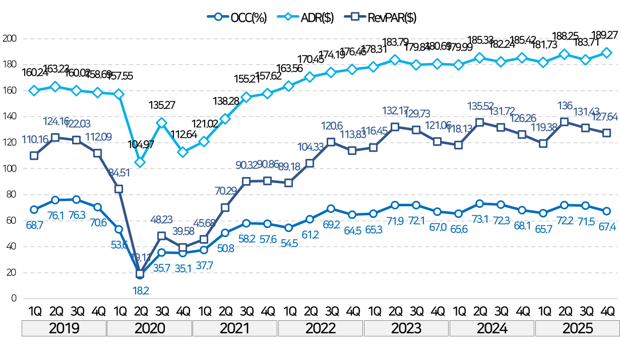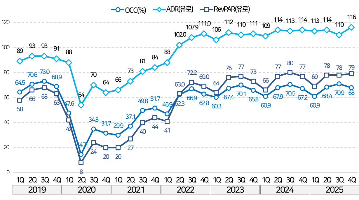 대형 호텔 체인들은 OCC(객실점유율) 하락을 ADR(평균객실료) 인상으로 간신히 방어하며 '성장 정체'의 늪에 빠진 모습입니다.