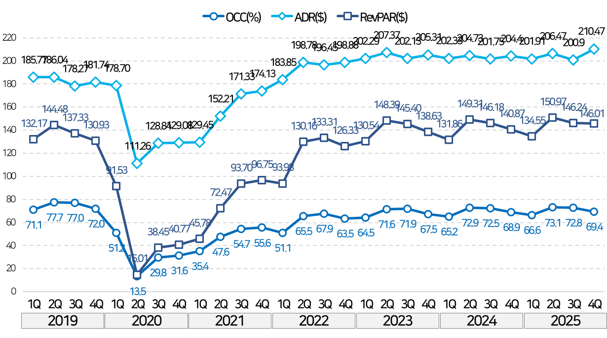 ADR은 210.47달러로 전년 대비 3.0%나 상승했습니다.
