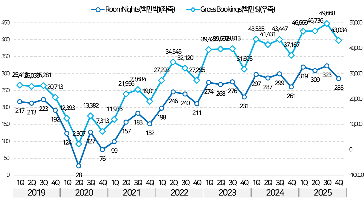 RoomNights는 좌축이 기준이며, Gross Bookings는 우축이 기준입니다.