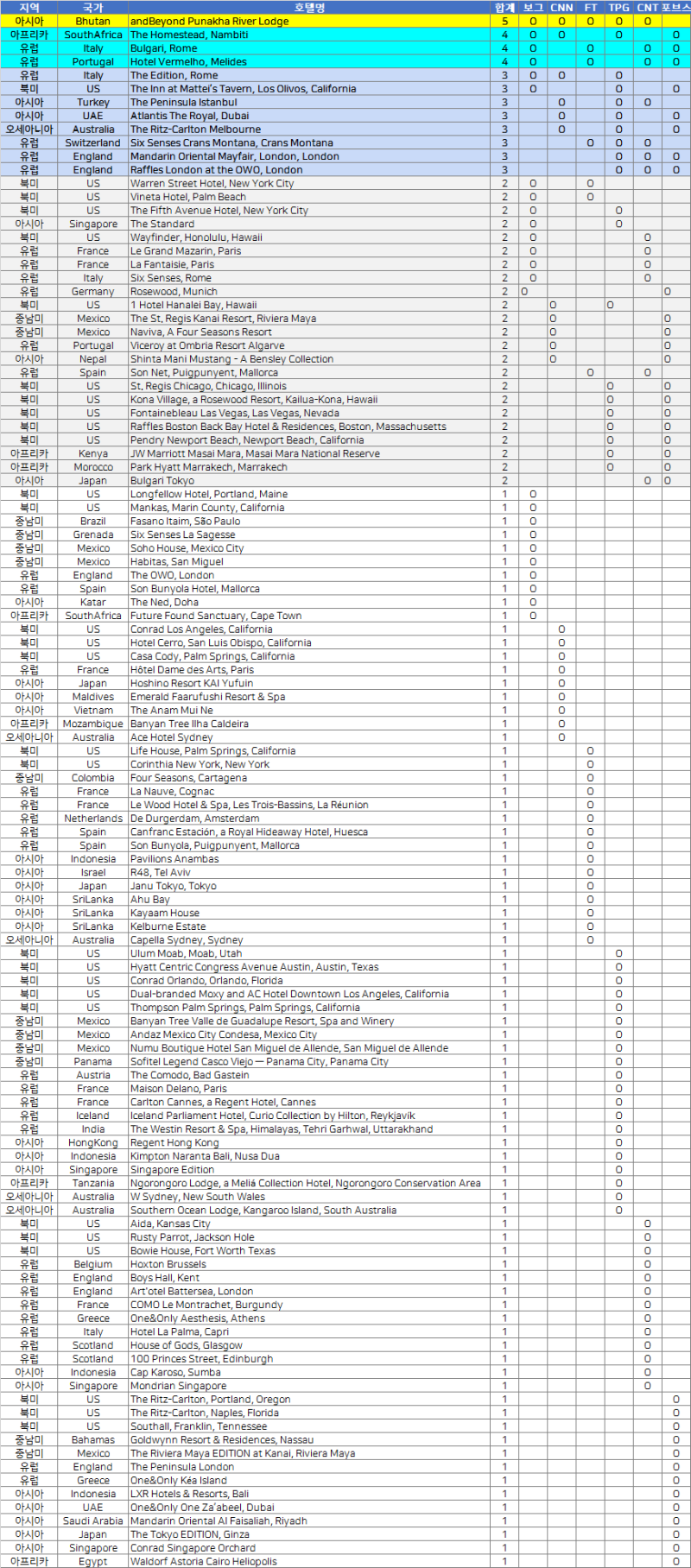 시트1 지역정렬,지역,국가,호텔명,합계,보그,CNN,FT,TPG,CNT,포브스 4,아시아,Bhutan,andBeyond Punakha River Lodge,5,O,O,O,O,O 5,아프리카,SouthAfrica,The Homestead, Nambiti,4,O,O,O,O 3,유럽,Italy,Bulgari, Rome,4,O,O,O,O 3,유럽,Portugal,Hotel Vermelho, Melides,4,O,O,O,O 3,유럽,Italy,The Edition, Rome,3,O,O,O 1,북미,US,The Inn at Matte...