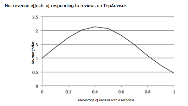 그러나 45%가 넘어가는 경우 매출이 오히려 줄어들고 있고, 모든 리뷰에 응답하는 호텔의 매출은 오히려 전혀 응답하지 않는 호텔보다 낮다는 것을 보여주고 있습니다.