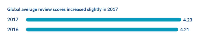 그래프를 보시면 아시겠지만, 2017년 전세계 호텔 리뷰의 평균 평점은 4.23점으로 2016년 4.21점에 비해 0.02점 상승했습니다. 4점대 초반으로 좋은 모습을 이어가고 있습니다. 지역별로는 유럽이 상대적으로 낮은 모습을 보였습니다. 아시아 지역에서는 싱가포르 호텔들의 평균 평점이 2016년 4.15점에서 2017년 4.23점으로 증가했습니다. 중국은 2016년 4.43점에서 2017년 4.53점으로 상승해 세계에서 가장 높은 평균 평점을 얻은 것으로 나타났습니다.