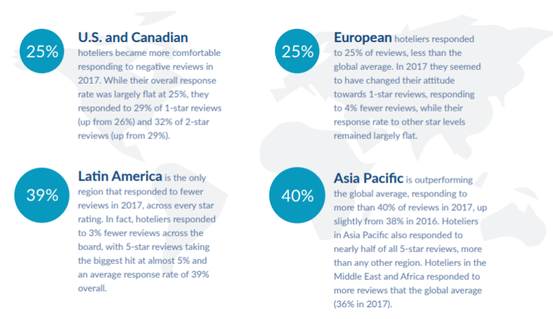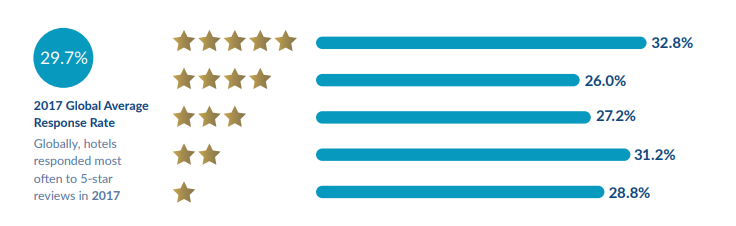위 그래프는 고객들의 별점 평가 결과에 따라 호텔들의 리뷰 응답률을 나타낸 그래프입니다. 보시면 아시겠지만 전체 리뷰 중 29.7%에 대해 대응을 한 것을 알 수 있습니다. 이러한 수치는 2016년 27.9%에 비해 1.8%포인트 상승한 수치라고 합니다. 이는 호텔들이 좋은 리뷰를 신경씀은 물론이고 나쁜 리뷰에 적극적으로 대응하고 있기 때문입니다.