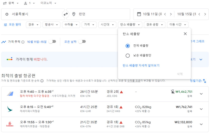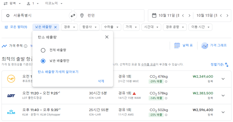 1. 구글 항공의 탄소배출량 표시/필터