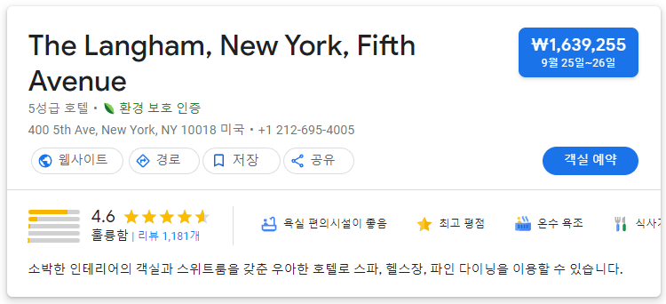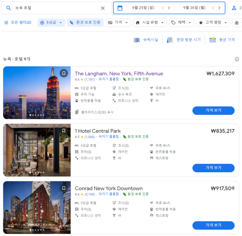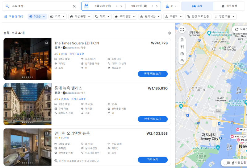위 사진은 뉴욕 시내 5성급 호텔 검색 결과 입니다.