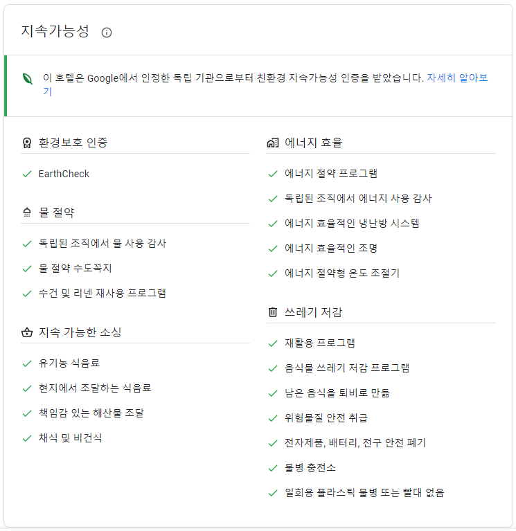 구글은 호텔 검색 결과에도 환경보호 인증 관련 내용을 표시하고 있습니다.