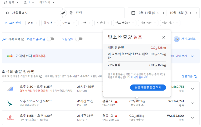(최저가 항공권은 탄소배출량이 표시되지 않아서 두번째 옵션을 보았습니다.)