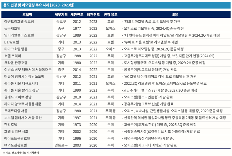 당장 위 표를 보더라도 20년과 21년에 비해 22년~23년에는 그대로 호텔로 운영하는 사례가 많습니다.