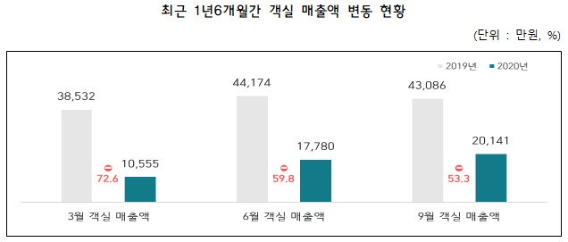 우선 19.3월부터 20.9월까지 객실 매출은 47.7% 줄어들었다고 합니다.