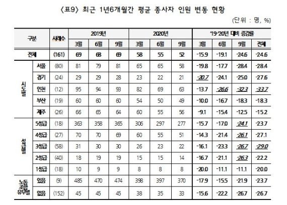 위 표에는 없지만 고용 형태에 따라서는 정규직은 12.6%(7,219명→6,306명), 비정규직은 33.3%(2,074명→1,384명), 일용직은 65.8%(1869명→640명) 감소했다고 합니다.