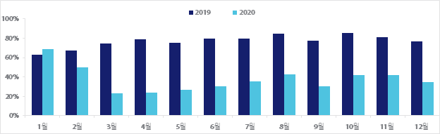 2019년 71.0% → 2020년 39.4% → 2021년 1~4월 45.1% 입니다.