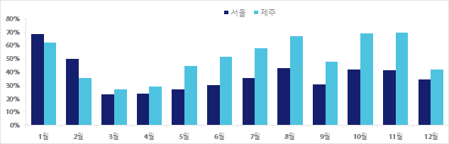 이 자료는 서울/인천 지역과 지방의 객실점유율 추이를 보여주는 그래프인데요.