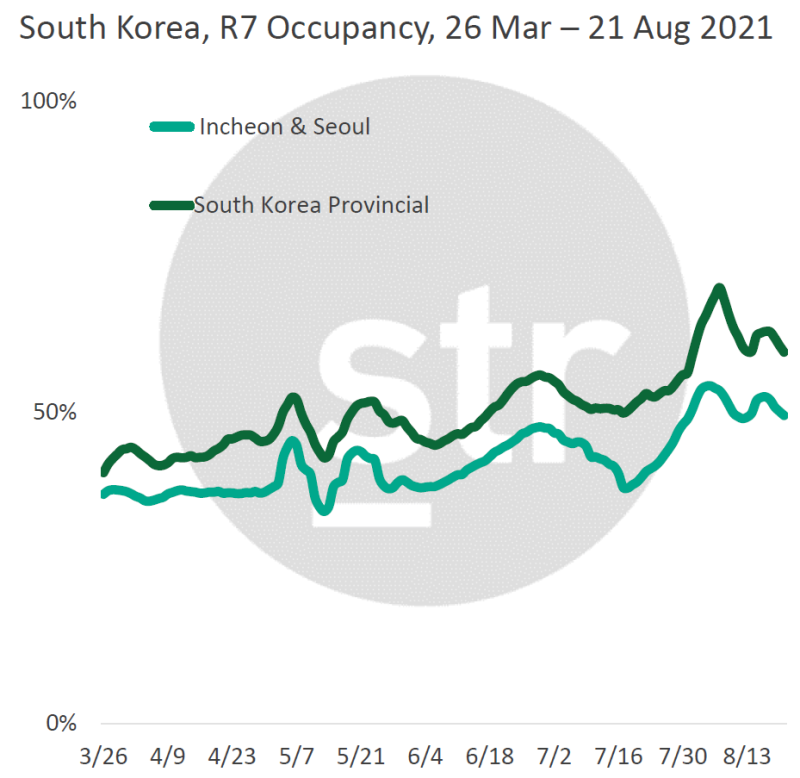 8월 중순까지의 국내호텔들의 객실점유율(OCC, 7일 이동평균) 그래프인데요.