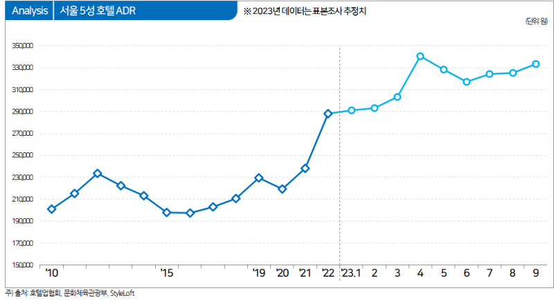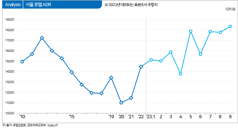 서울호텔의 ADR(Average Daily Rate; 평균객실료)은 코로나 이전을 넘어 역대 최고치입니다.