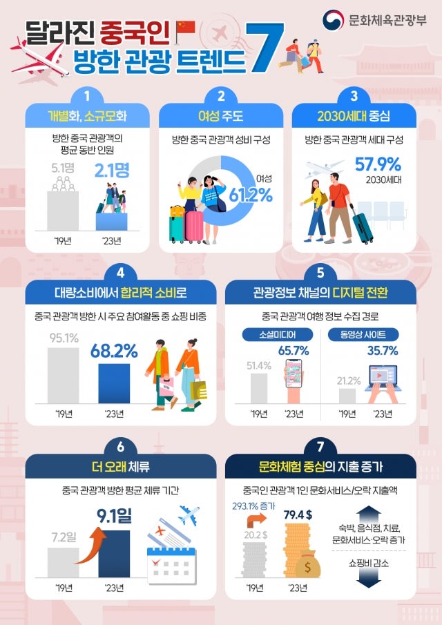 문화체육관광부는 한국문화관광연구원과 함께 코로나19 이후 ‘방한 중국관광 트렌드 변화 분석’ 보고서를 발표하며 2023년 중국인 방한 관광 7대 트렌드를 27일 소개했다. 중국은 상대적으로 늦은 2023년 1월 해외