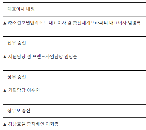대표이사 내정 ▲ ㈜신세계 대표이사 겸 ㈜신세계센트럴시티 대표이사 박주형 상무 승진 ▲ 상품본부장 겸 BTS담당 장수진 ▲ 갤러리담당 허제 ▲ 강남점 고객서비스담당 이혜정 ▲ 천안아산점장 김경환 상무보 승진 ▲ 하남