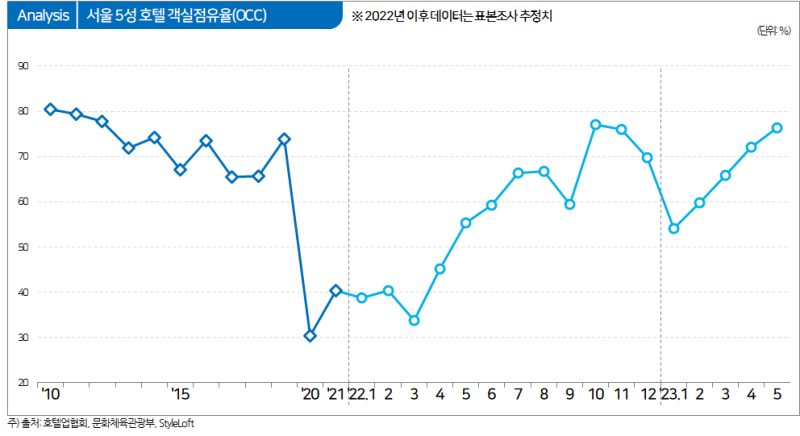 보시면 코로나로 인해 직격탄을 맞았던 객실점유율은 지속적으로 상승해