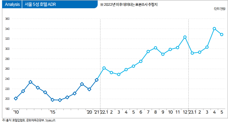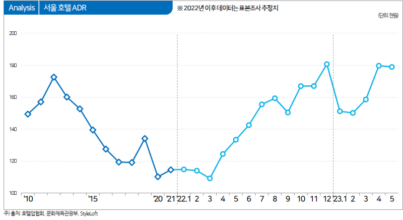 서울호텔의 ADR(Average Daily Rate; 평균객실료)은 코로나 이전을 넘어 역대 최고치를 기록하고 있습니다.