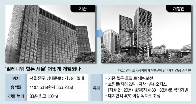 서울 중구 밀레니엄힐튼서울 호텔(힐튼호텔)이 기존보다 약 2배 높은 최고 38층(150m)짜리 오피스와 쇼핑몰, 호텔이 어우러진 빌딩으로 재개발되는 방안이 추진된다. 힐튼호텔이 근대건축유산으로 통했던 점을 감안해 호