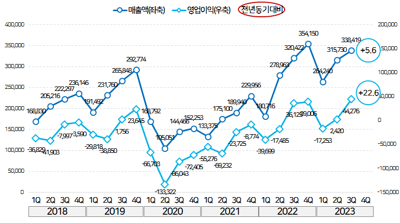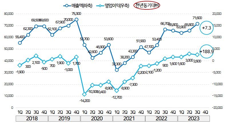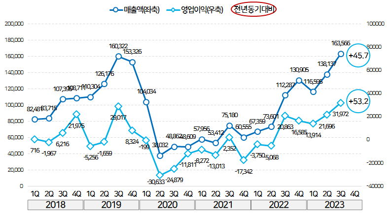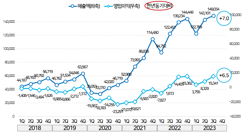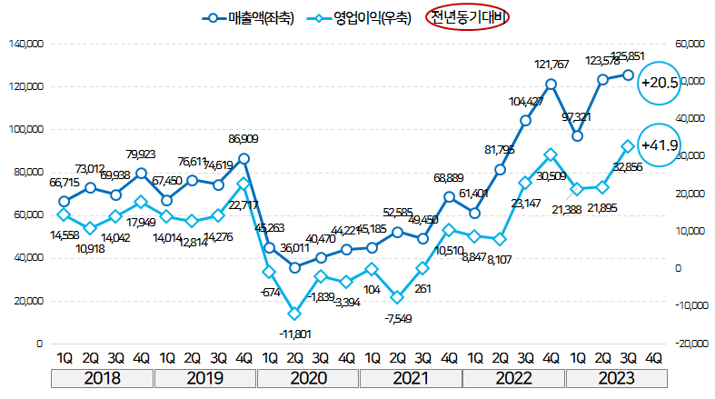 매출액은 좌축이 기준이며, 영업이익은 우축이 기준입니다.