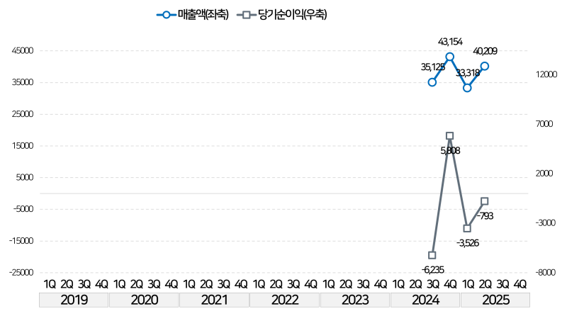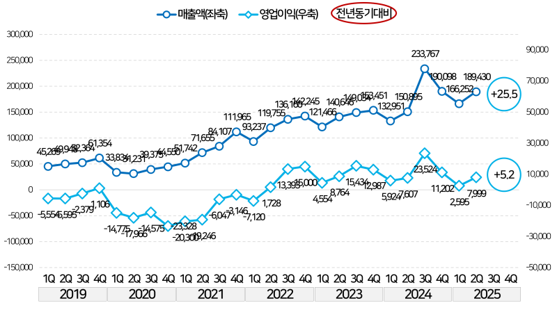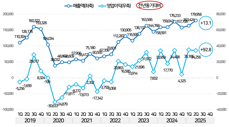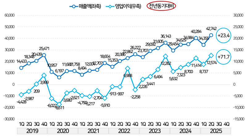 매출액은 좌축이 기준이며, 영업이익은 우축이 기준입니다.