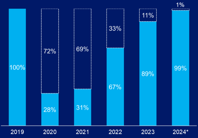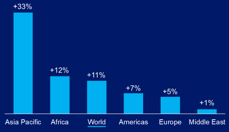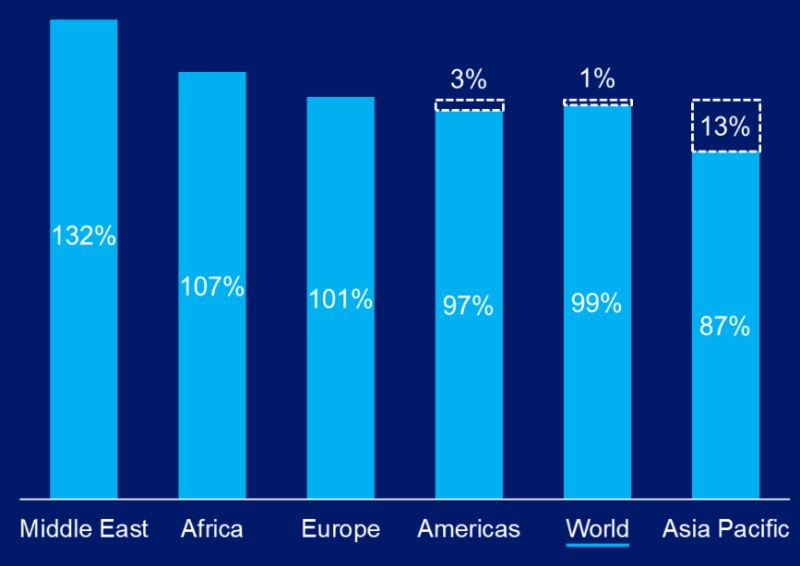 반면, 아시아 태평양 지역은 아직도 판데믹 이전 대비 13%나 낮은 87%를 기록했습니다.