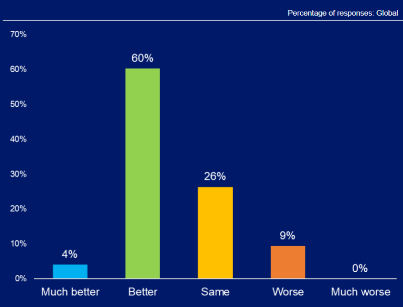 지역별로 보면 아프리카가 80%, 아시아 태평양 지역이 75% 순으로 좋아질 것이라고 응답했습니다.