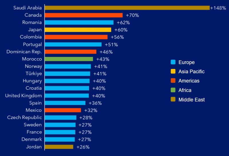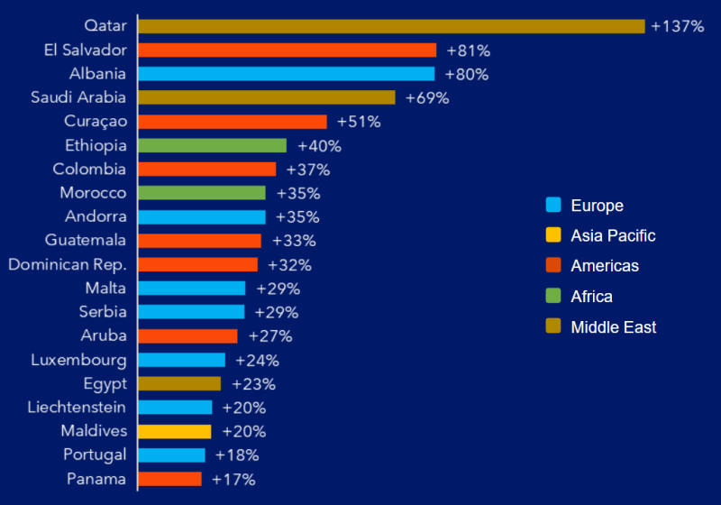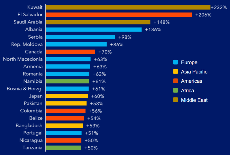 국가별로는 쿠웨이트, 엘살바도르, 사우디아라비아, 알바니아가 100%가 넘는 성장을 기록했습니다.
