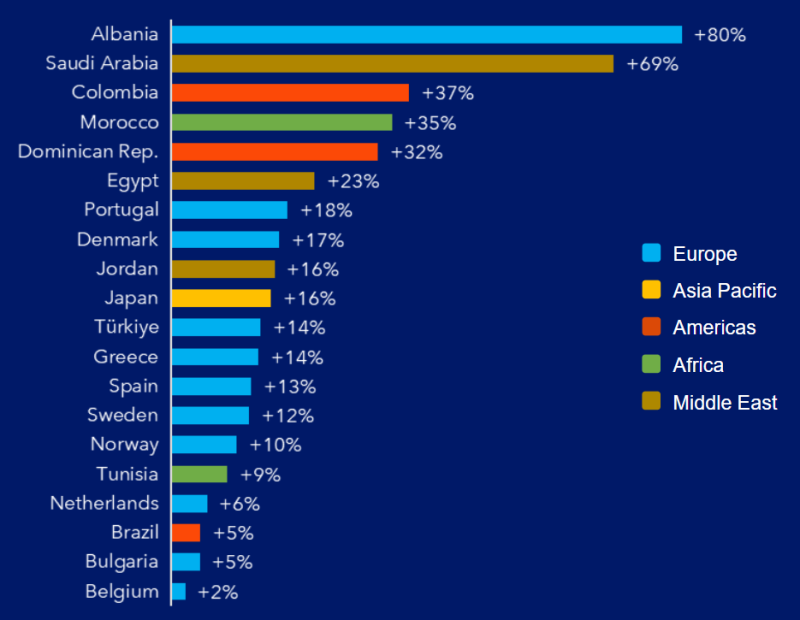 알바니아가 80% 증가하며 가장 높은 성장을 기록했습니다.