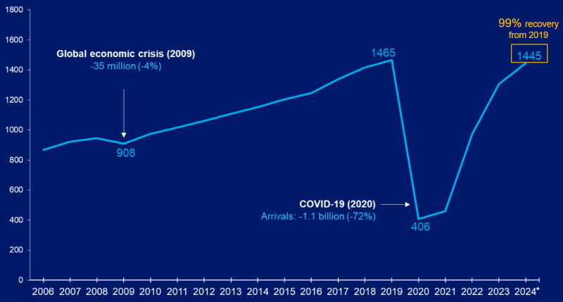 2024년 국제 관광객 도착 인원은 약 14.45억명으로 나타났습니다.