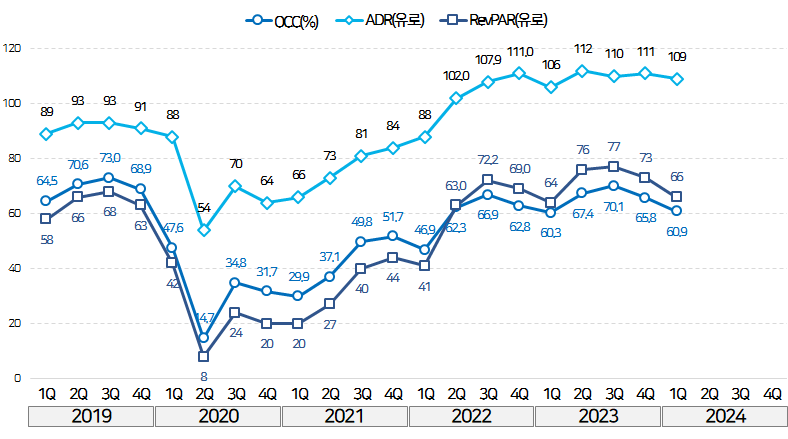 RevPAR(Revenue per available room, 가용객실 당 매출)(단위:$, 유로)