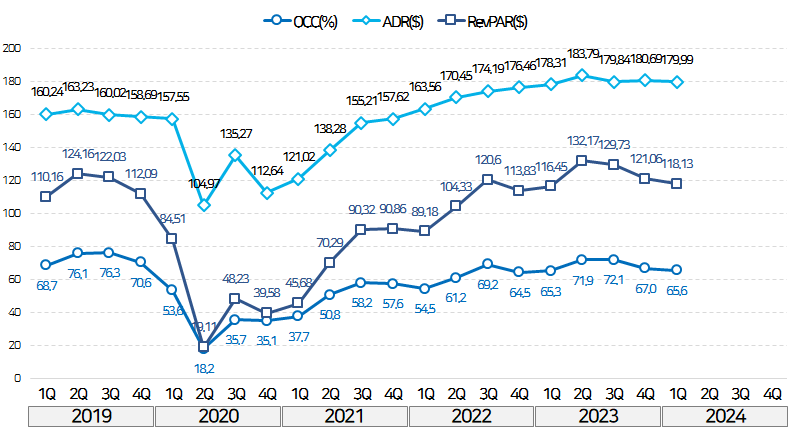 RevPAR(Revenue Per Available Room)는 118달러 수준을 보였습니다.