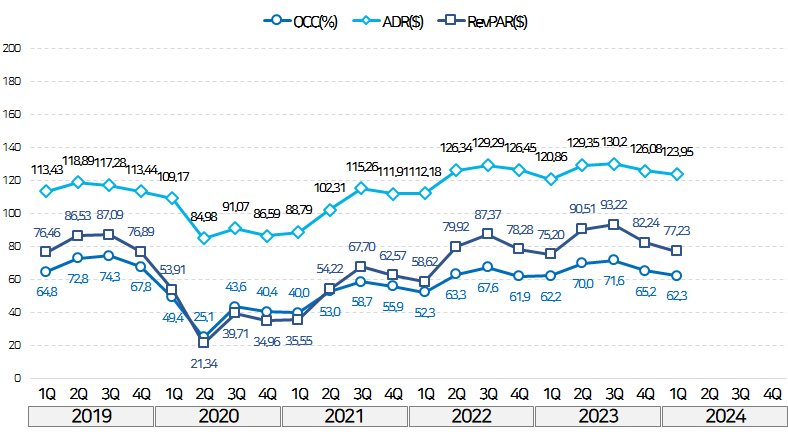 요즘에는 ADR이 높아서인지 OCC는 꺾이는 모양새입니다.