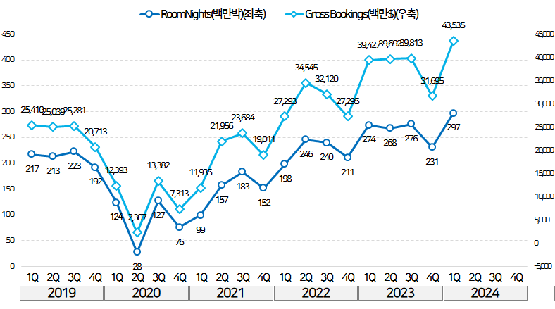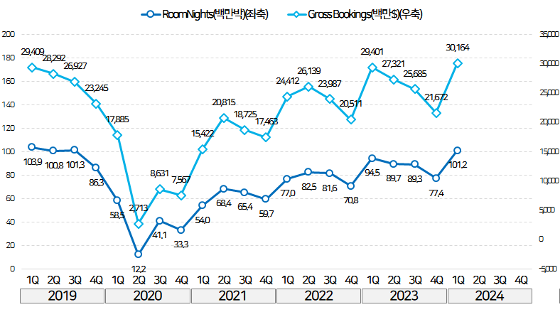 참고) 익스피디아는 2018년까지는 실제 숙박일 수(Stayed Room Nights), 그 이후는 예약 숙박일 수(Booked Room Nights)(2023년 1분기 이후 실제 숙박일 수가 발표에서 제외되어 변경)