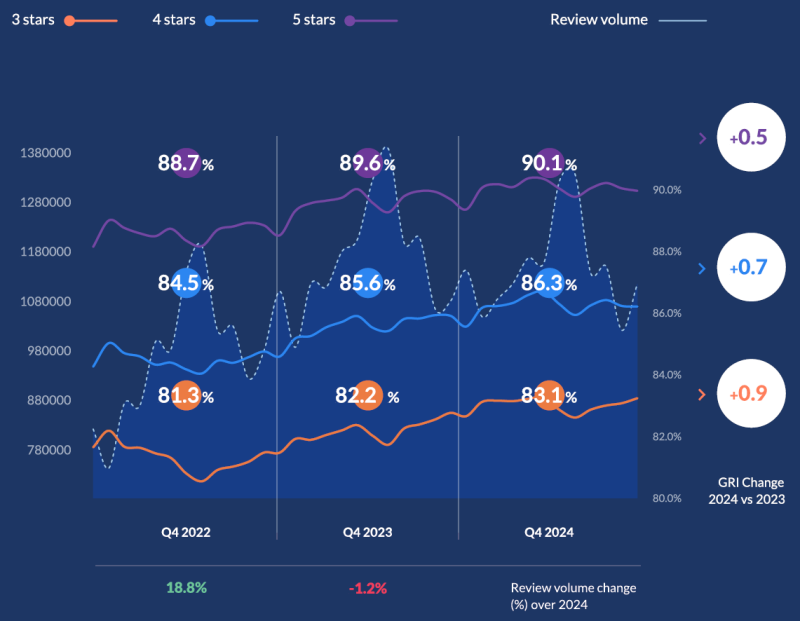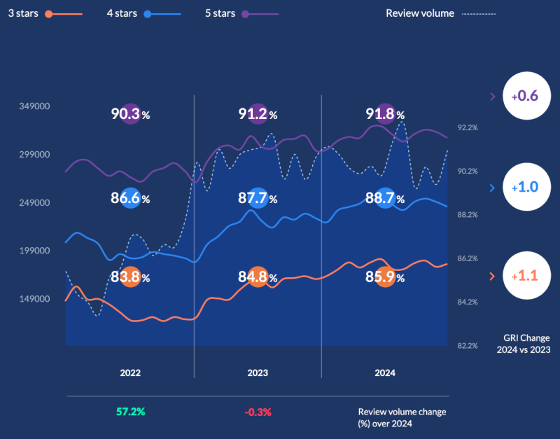 글로벌 리뷰 지수(만족도)는 86.2%로 전년대비 0.7%포인트 상승했습니다.