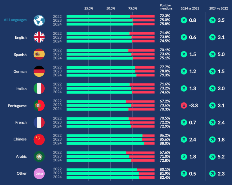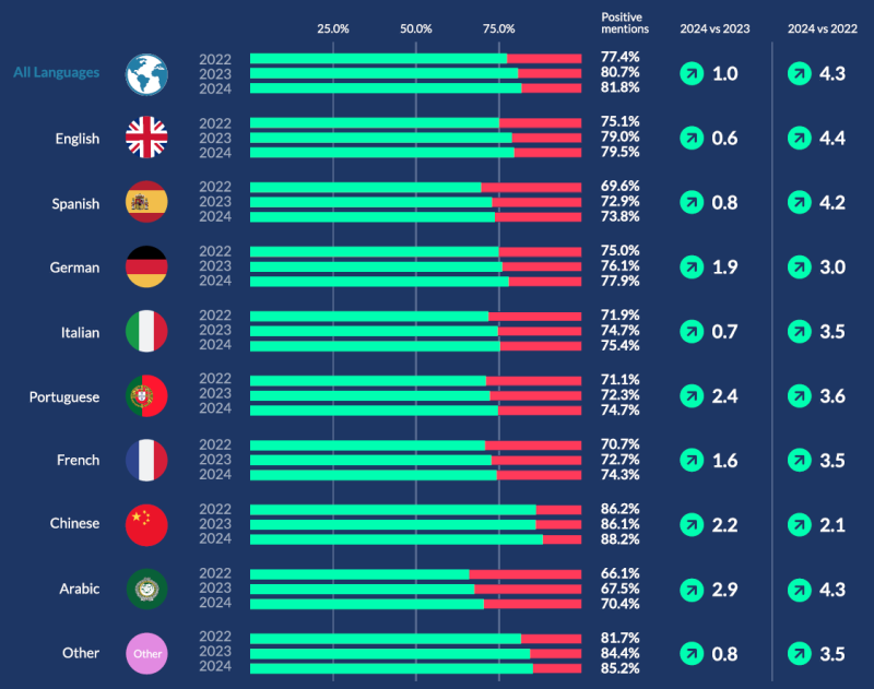 언어별 감정분석 결과 역시 글로벌과 유사합니다.