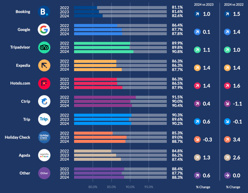 채널별로는 역시 씨트립과 트립닷컴, 독일어권 OTA인 Holyday Check이 높았습니다.