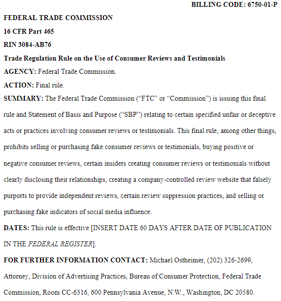 Federal Trade Commission Announces Final Rule Banning Fake Reviews and Testimonials