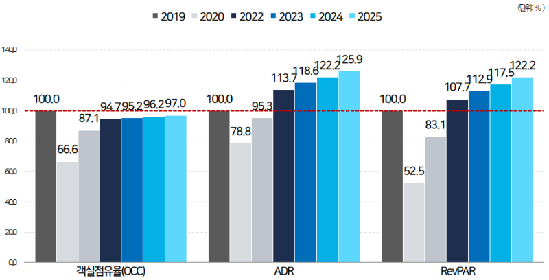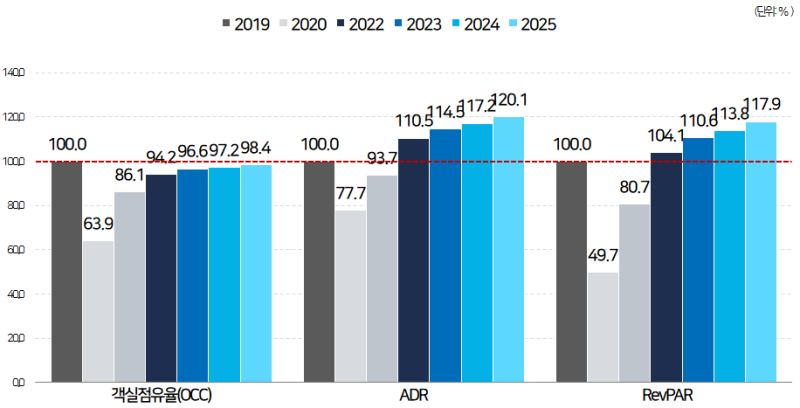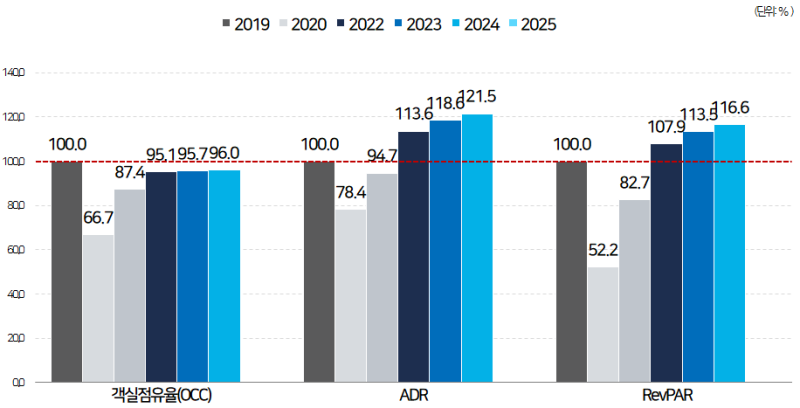 객실점유율(OCC)은 2025년이 되어서도 코로나 이전 수준을 회복하지 못하는 것으로 나타났습니다.