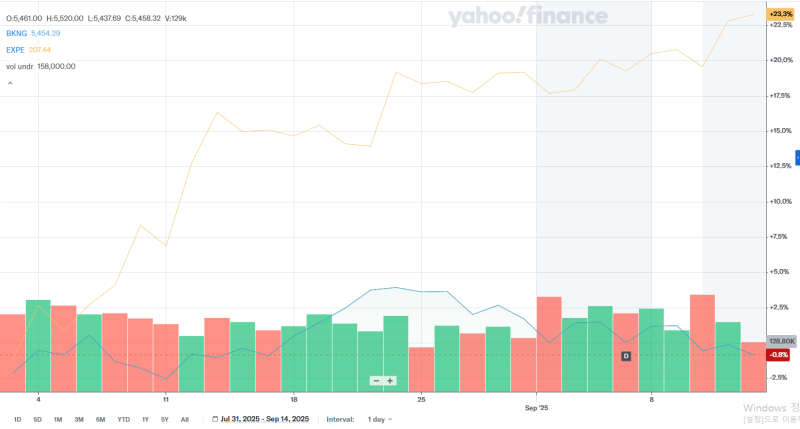 10,000개 호텔이 소송을 했다는 소식이 알려진 8월 초부터 부킹닷컴과 익스피디아의 주가 상승률을 보면 차이가 극명하게 드러납니다.