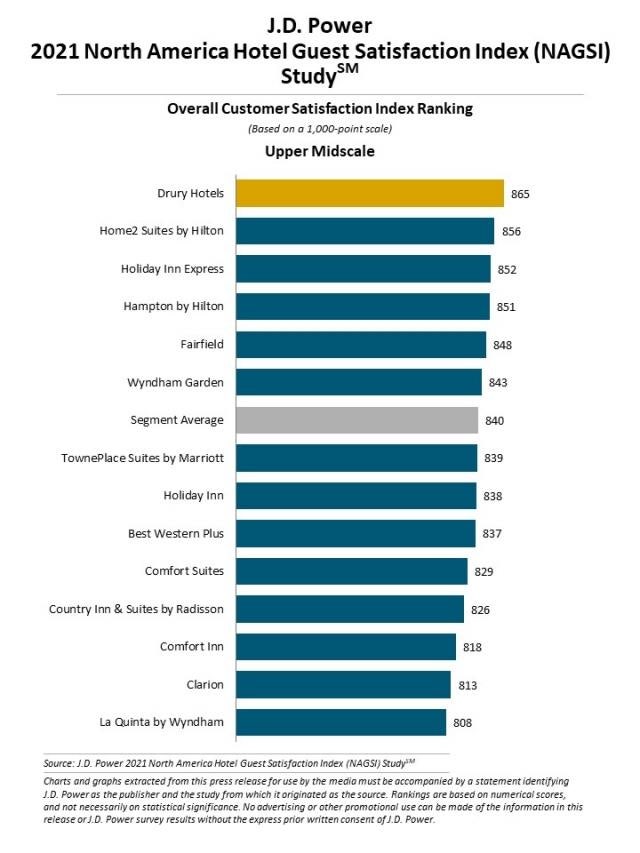 어퍼 미드스케일 클래스에서는 이 클래스의 절대 강자 Drury 호텔이 16년 연속 1위를 차지했습니다.