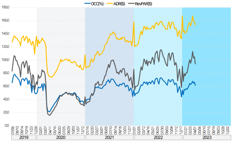 최근의 실적은 기조과 같이 상대적으로 회복이 더딘 OCC, 높은 ADR이 이어지고 있습니다.