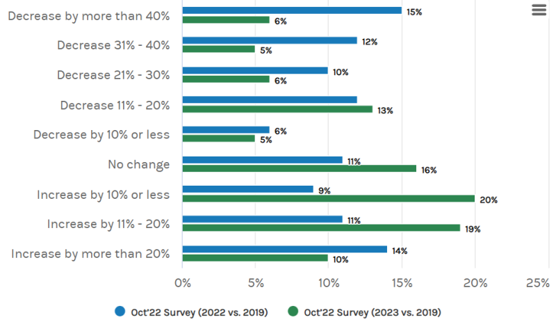 위 조사결과를 보시면 23년 출장 예산이 증가한다는 녹색 막대가 크게 늘어난 것을 알 수 있습니다.