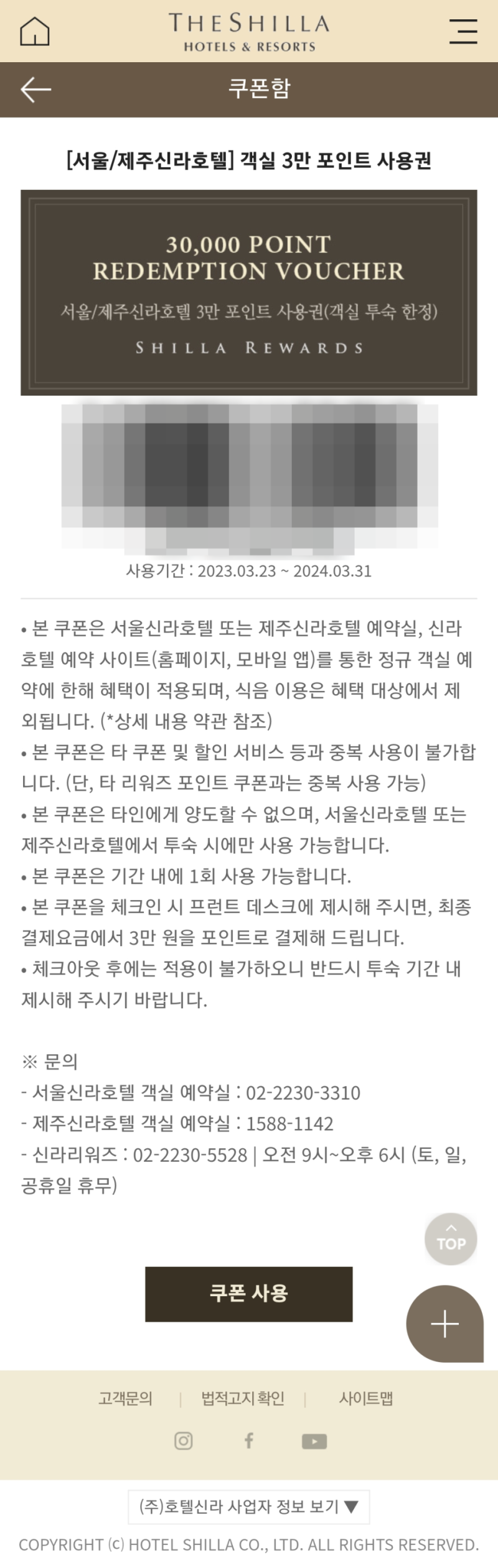 위 캡쳐사진의 내용대로 서울과 제주 신라 객실 3만원 쿠폰을 준다는 것인데요.
