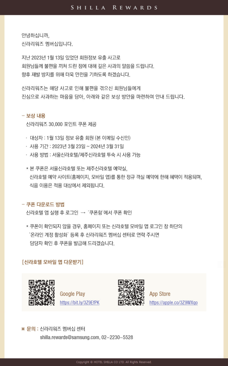 얼마전 신라에서 발생한 개인정보 유출사건의 보상안이 안내되었습니다.