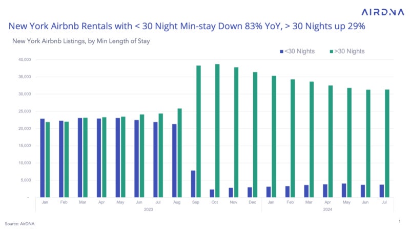 AirDNA의 데이터에 따르면, 2023년 7월부터 2024년 7월까지 30일 미만의 숙박을 위한 에어비앤비 목록이 83% 감소했으며, 전체 등록 수는 24% 줄었습니다.