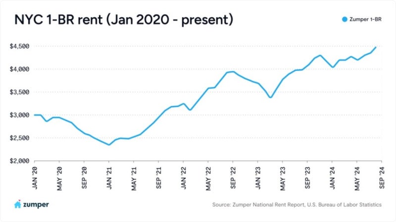 Zumper의 전국 임대 보고서에 따르면, 24년 9월 원룸의 임대료 중위값은 전년동기대비 12.8% 상승한 역대 최고치를 기록했습니다.
