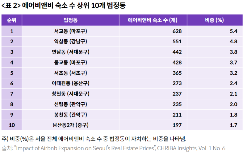 위 차트는 CHRIBA에서 정리한 서울의 에어비앤비 분포도와 상위 10개 행정동인데요.