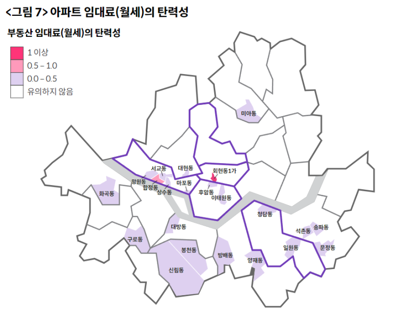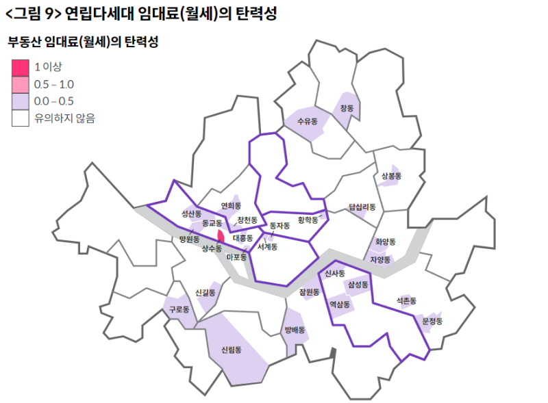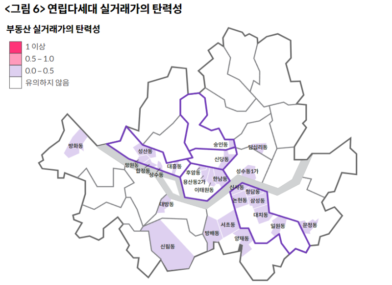 연립다세대 주택의 밀집도가 높은 지역들(망원동, 합정동, 대방동, 신림동, 후암동, 이태원동 등)에서 영향이 있었던 것으로 나타났습니다.