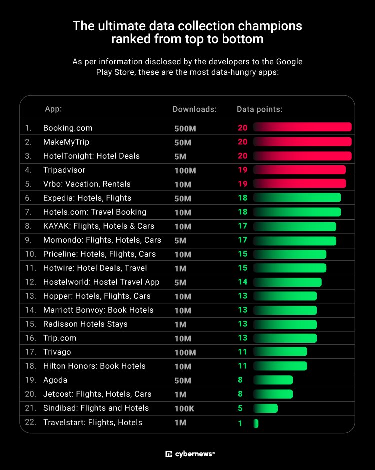 위 표는 각 여행앱이 요청하는 권한에 따라 많은 권한을 요청하는 앱의 순위를 매긴 것입니다.